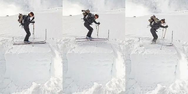1, 2 или 3: Блок обваливается перед первым прыжком. На склоне с похожими снежными условиями велика вероятность спуска лавины лыжником, сноубордистом, туристом или снегоходом.