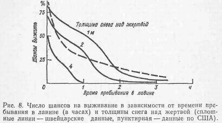 Статистические данные по США и Канаде говорят о том, что к отдаленным группам спасатели прибывают в среднем не раньше, чем через 10 часов, а находят жертвы только через 38 часов после катастрофы, то есть из-под снега извлекаются, как правило, трупы.