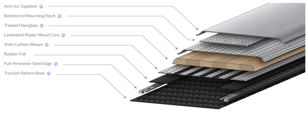 Прочная и демпфирующая конструкция из клёна с триаксиальным стекловолокном для безкомпромиссной производительности на трассе или вне её. Узор для тяги "BC" включен под ногой для уменьшения количества переходов при движении по ровной местности.