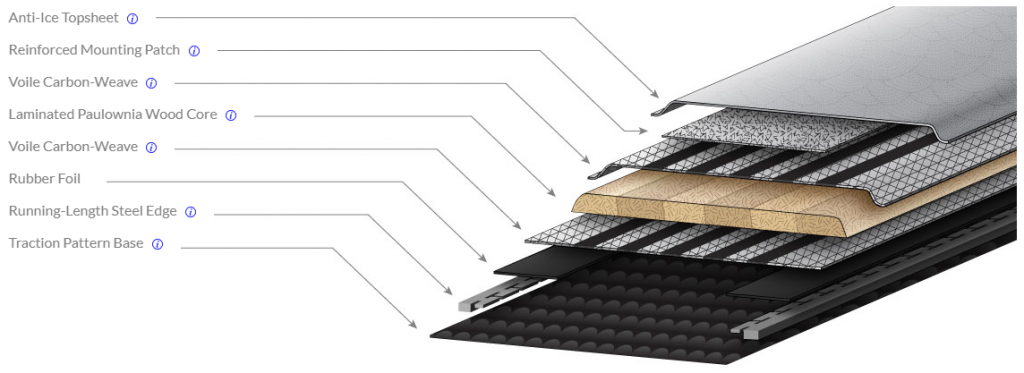 Талия: Длинная длина бега. Разработана для сильной кромочной устойчивости на большой скорости и крутых склонах. Кэмбер под ногами для стабильности.